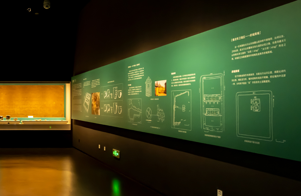 大型背景板与展柜的组合是展陈设计中常见的陈列方式,在这个场景中, 我们将柜内照明系统进行了柜外应用。 LEDme Wall Washer 洗墙系列与LEDme Showcase 投射调焦灯具组合使用,洗墙灯具提供了垂直面图文版面照明,投射调焦灯具则针对一级标题作重点照明,同时也保证了底部展柜的通透性。