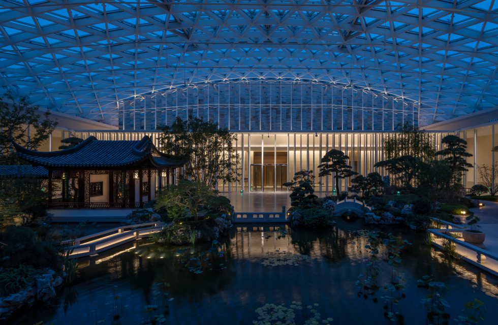 苏园入口处,PANTHER 投光灯装点树影,引导观众进入充满中式意蕴的园林,步入苏园内部,柔性 InvisiLED NEON 灯带紧密贴合石桥轮廓,水下灯打造柔和光影,相互铺就一条灵动的光影动线。