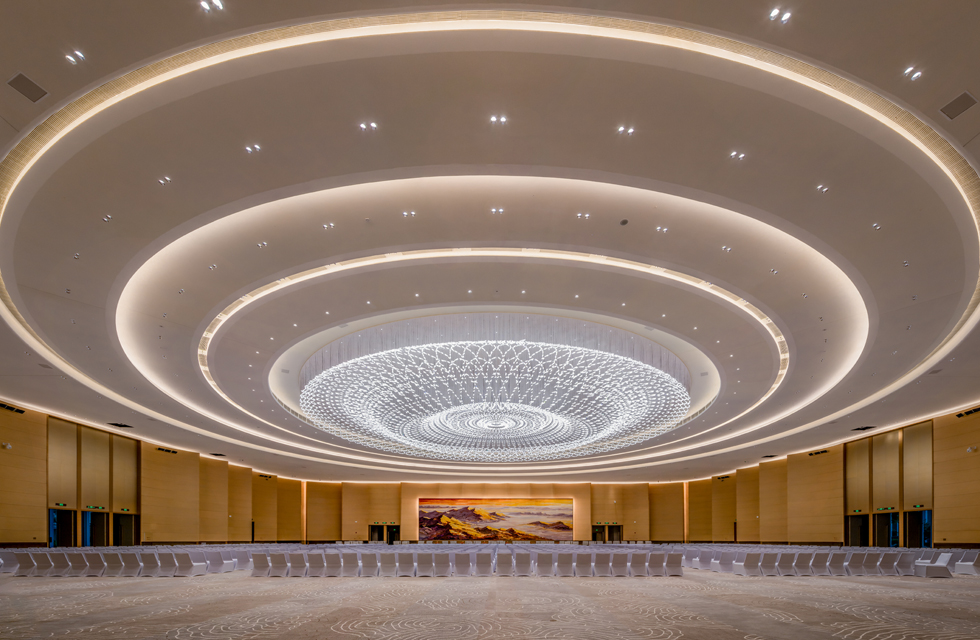 峰会厅以空间中心为原点,筒灯向外圈逐次散开,天花灯带巧妙排布,精准呈现“天圆地方”的设计形态。宴会厅采用 VOLTA 筒灯确保整体空间光线充足,再将灯带融入天花,为宴会厅打造雅致格调。