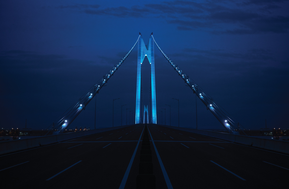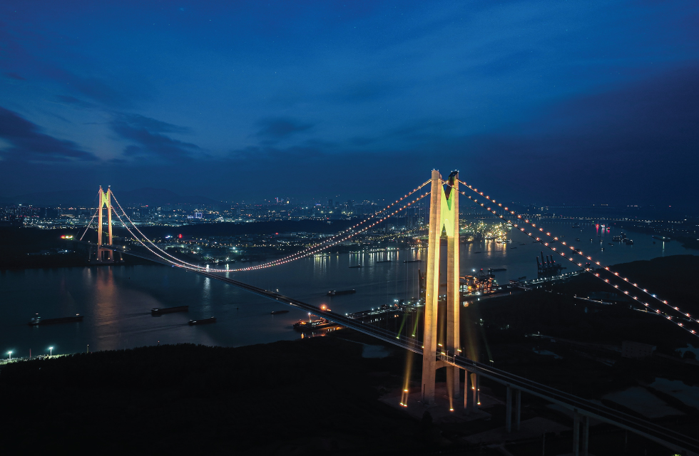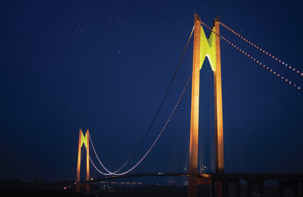主塔创新性地采用了多层次渐变投光技术,通过精密的灯光控制系统,实现了如丝绸般柔和的色彩过渡效果。这一照明设计开创了国内跨江桥梁夜景艺术的先河,既完美勾勒出263.8米主塔的挺拔身姿,又为长江夜色增添了一抹流动的华彩。