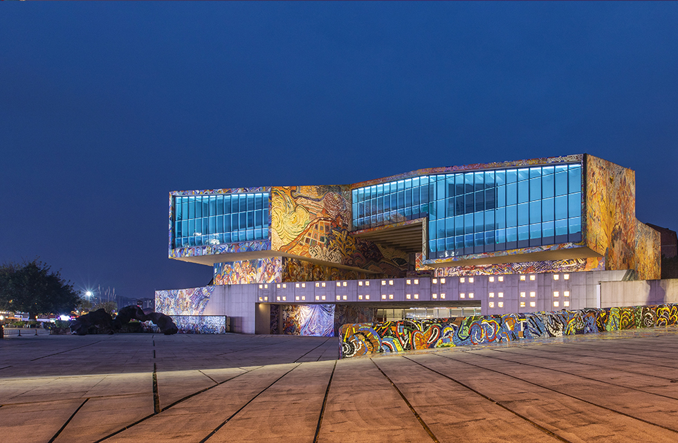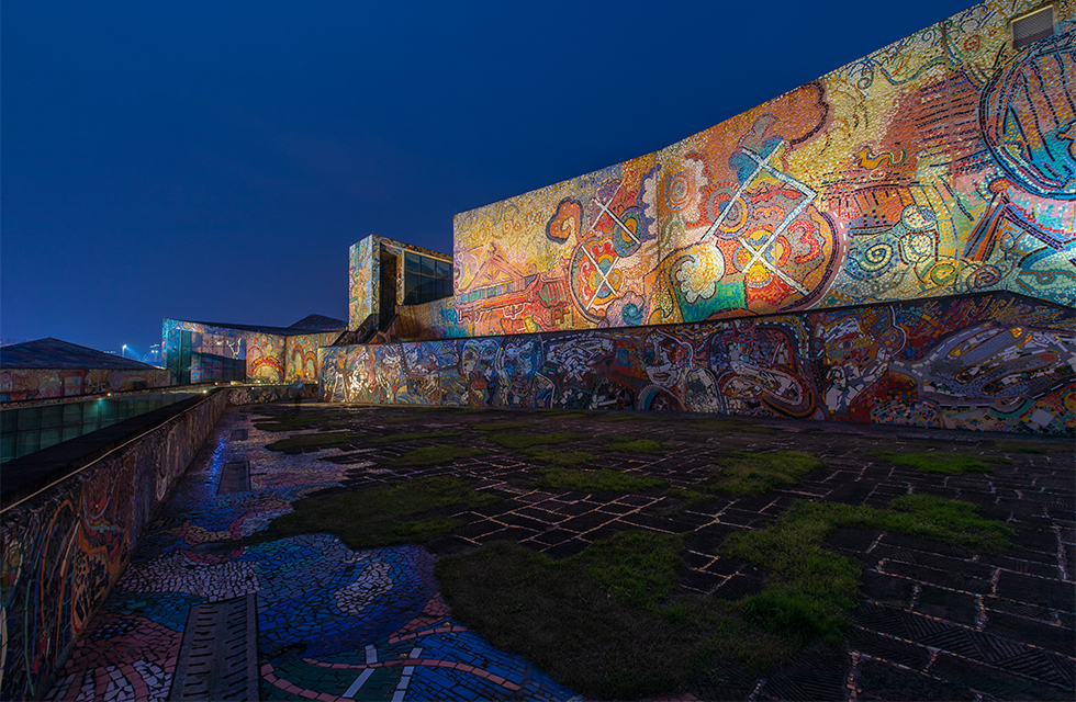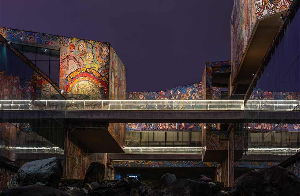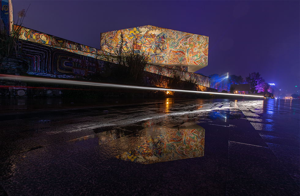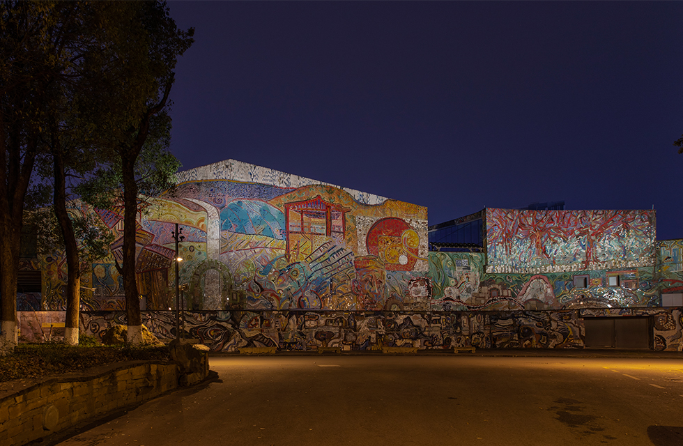 由深圳紫墨设计咨询有限公司(ZIMO)特别设计的四川美术学院美术馆(虎溪校区)外立面照明,以“寻找美的光”为立意, “光”作为眼睛的向导,在⼤⾯积⾊彩⽴⾯上找寻那份属于每个⼈⼼中不同的“美”;⽤“光”展现川美⼈对艺术的包容性,对“美”执着追求的精神。 美术馆外观由⾮规则⽅块组合⽽成,线条轮廓硬朗有⼒。灯光⼿法考虑突出线条,保证整体构成感。外立面大面积彩色瓷砖覆盖,为更好地还原其色彩,保证其艺术性,均采用了WAC高品质高显指户外灯具。