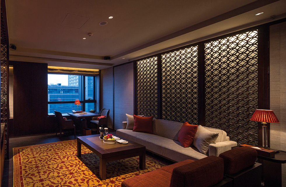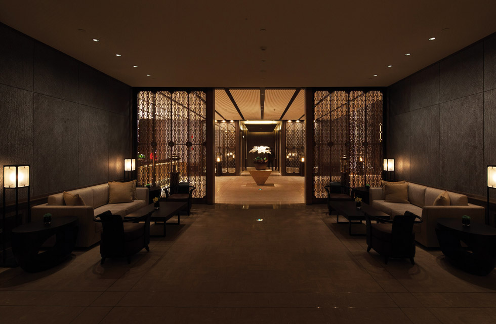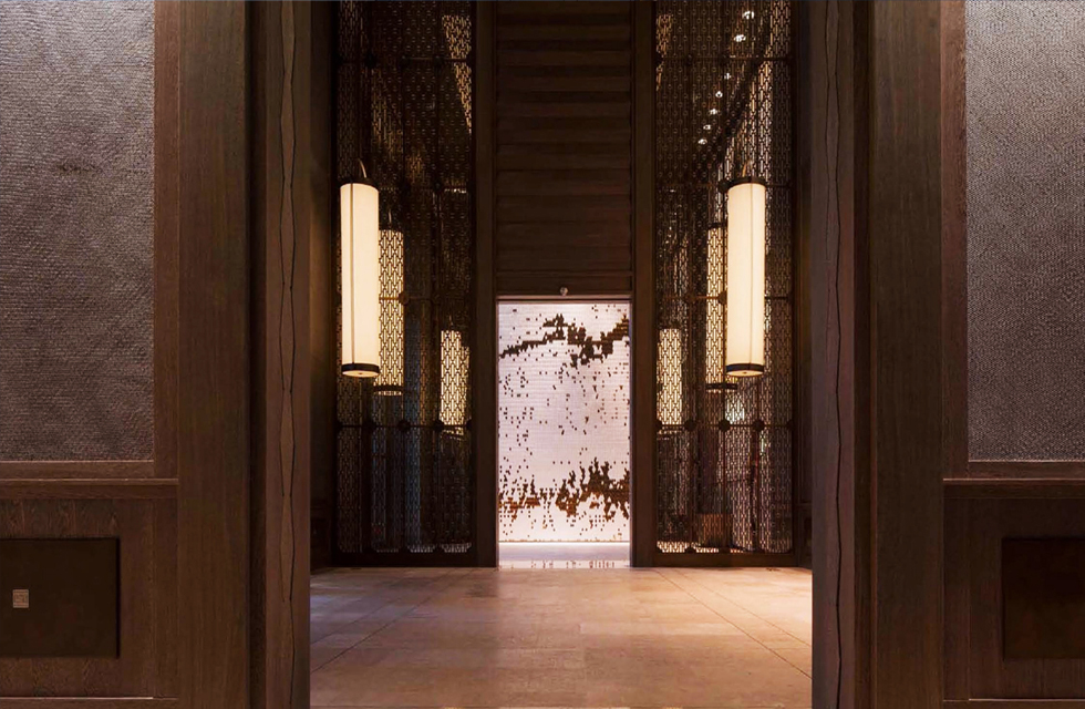 进入大堂,不同的功能区域用中式传统屏风隔开,灯光明暗的对比更刻画出传统的空间秩序感。通过对空间各处亮度的规划安排,目光自然地将来访者引入宅院的深处。
