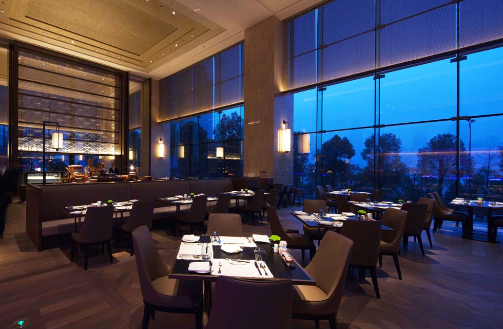 酒店的全日餐厅紧邻嘉陵江,是上佳的观景点,然而巨幅落地玻璃通常都会反射室内的光源,对夜景观赏造成困扰。为此,设计师特别注重控制垂直面上的亮度,尤其是避免使用发光面过亮的灯具,并且尽量减少灯具的数量。为此特意选用了WAC Lighting专为酒店设计的ELANA Pro系列筒灯。其具备专利设计的隐光技术,以及优秀的出光效果很好的解决了这一问题。最终提供了内外交融的夜间光环境,为来访者创造了一个得以尽情欣赏对岸美景的机会。