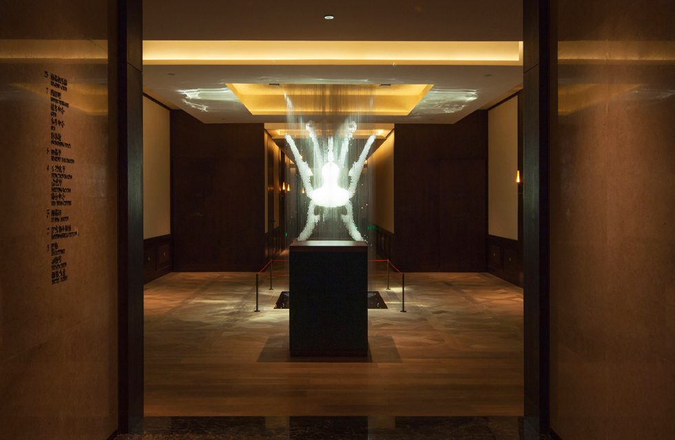 设计团队将出土于巴渝的经典文物“鸟形尊”以现代美学设计呈现在中餐厅入口。照明设计师用低色温漫反射光形成环境氛围,同时采用高色温的灯光将这个水晶艺术品的晶莹剔透最大程度的凸显。与此同时,直射向艺术品的强光特意避开来访者接近的方向。