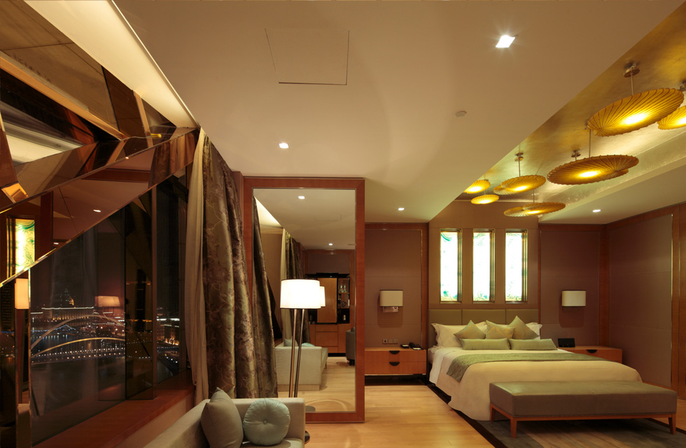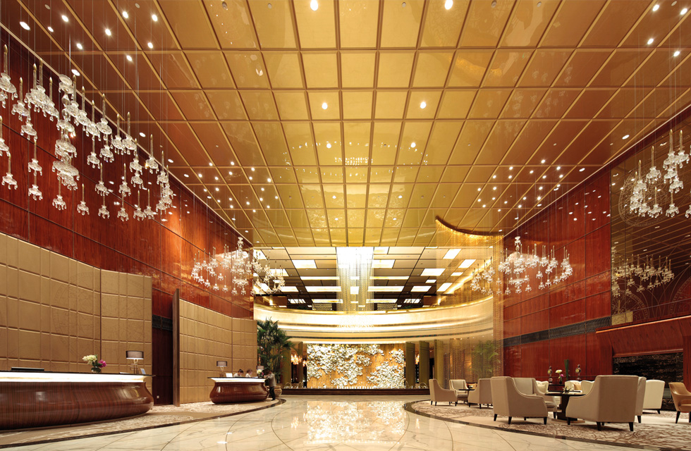 酒店暗朱红的木质墙壁中,嵌入LED展示灯,熨帖墙面错落布局,散发出的妖娆柔光如绽放的朵朵花瓣,释放着夜的柔美芬芳。