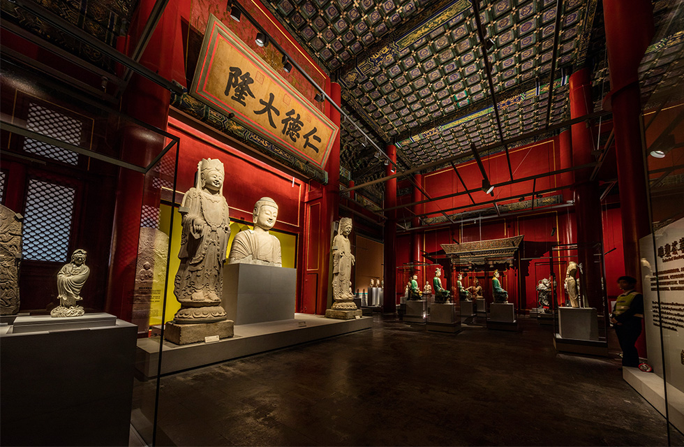 慈宁宫建筑位于紫禁城内廷隆宗门外西侧,始建于明嘉靖十五年,十七年建成。万历十一年火毁,十三年重建。 清沿明制,顺治十年重修慈宁宫,以后经历康熙、乾隆、光绪历朝修缮,明清两代均为太皇太后、皇太后居所。如 今,慈宁宫被重新修缮作为故宫雕塑馆开放,正殿为雕塑荟萃馆,东庑为修德白石馆,西庑为汉唐陶俑馆。