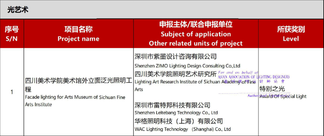 2021年6月1日, 亚洲照明设计师协会正式宣布由深圳市紫墨设计咨询有限公司、四川美术学院照明艺术研究所、深圳市雷特邦科技有限公司、华格照明科技(上海)有限公司联合申报的四川美术学院美术馆外立面泛光照明工程荣获2021年亚洲照明设计大奖光艺术类特别之光奖!