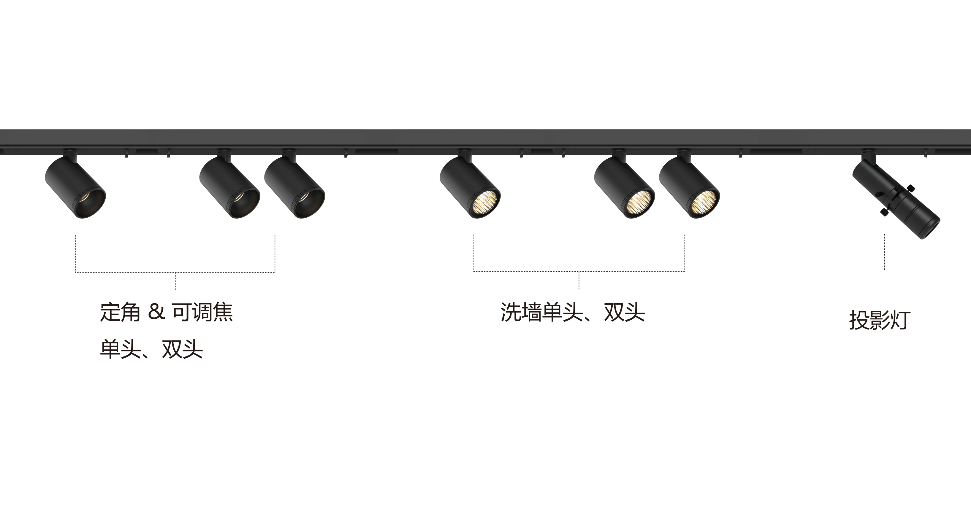 提供大中小三款尺寸选择,单头功率覆盖1w-5w, 定角&调角&洗墙&投影等照明功能可选